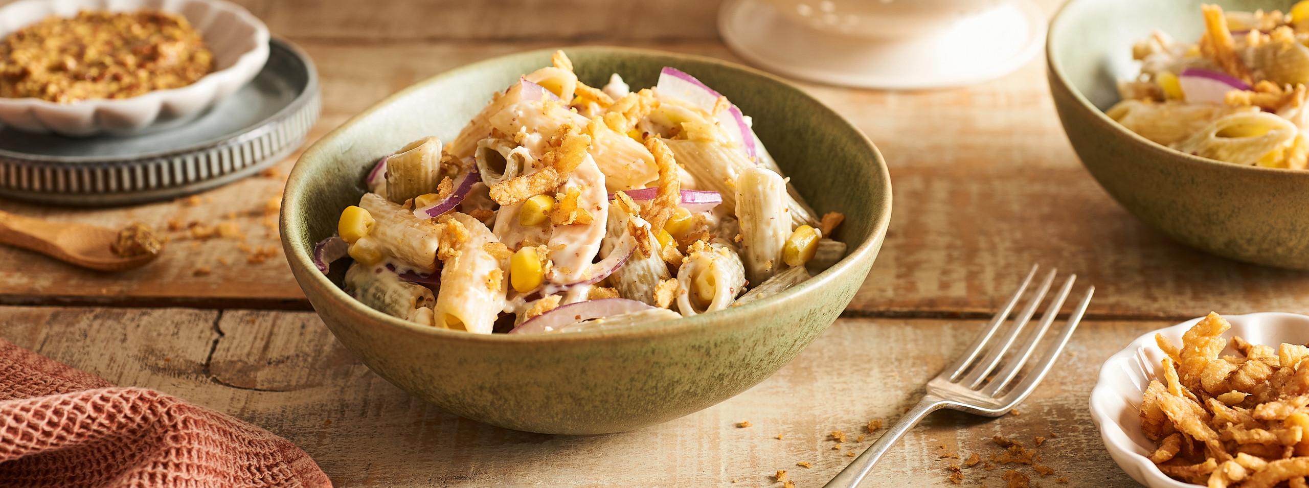 4. Una vez que la pasta esté tibia, agregar el aliño, pollo desmenuzado, cebolla morada, choclo e integrar bien.