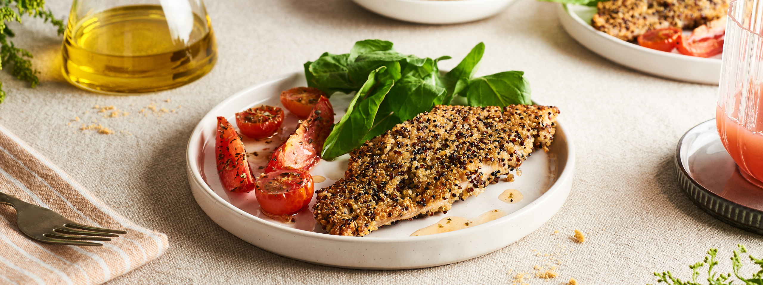 7. Calentar aceite en una sartén antiadherente y cocinar el pescado durante 3 minutos por lado, o hasta que esté cocido y la quínoa esté dorada.